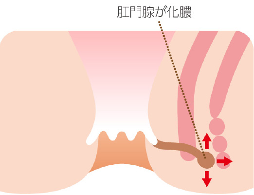 直腸の下にある肛門陰窩と言う場所に細菌が侵入し、その炎症が肛門周囲(まわり)に広がって膿がたまり、(発熱、激しい痛み、はれ等)ができるのが肛門周囲腫瘍です。